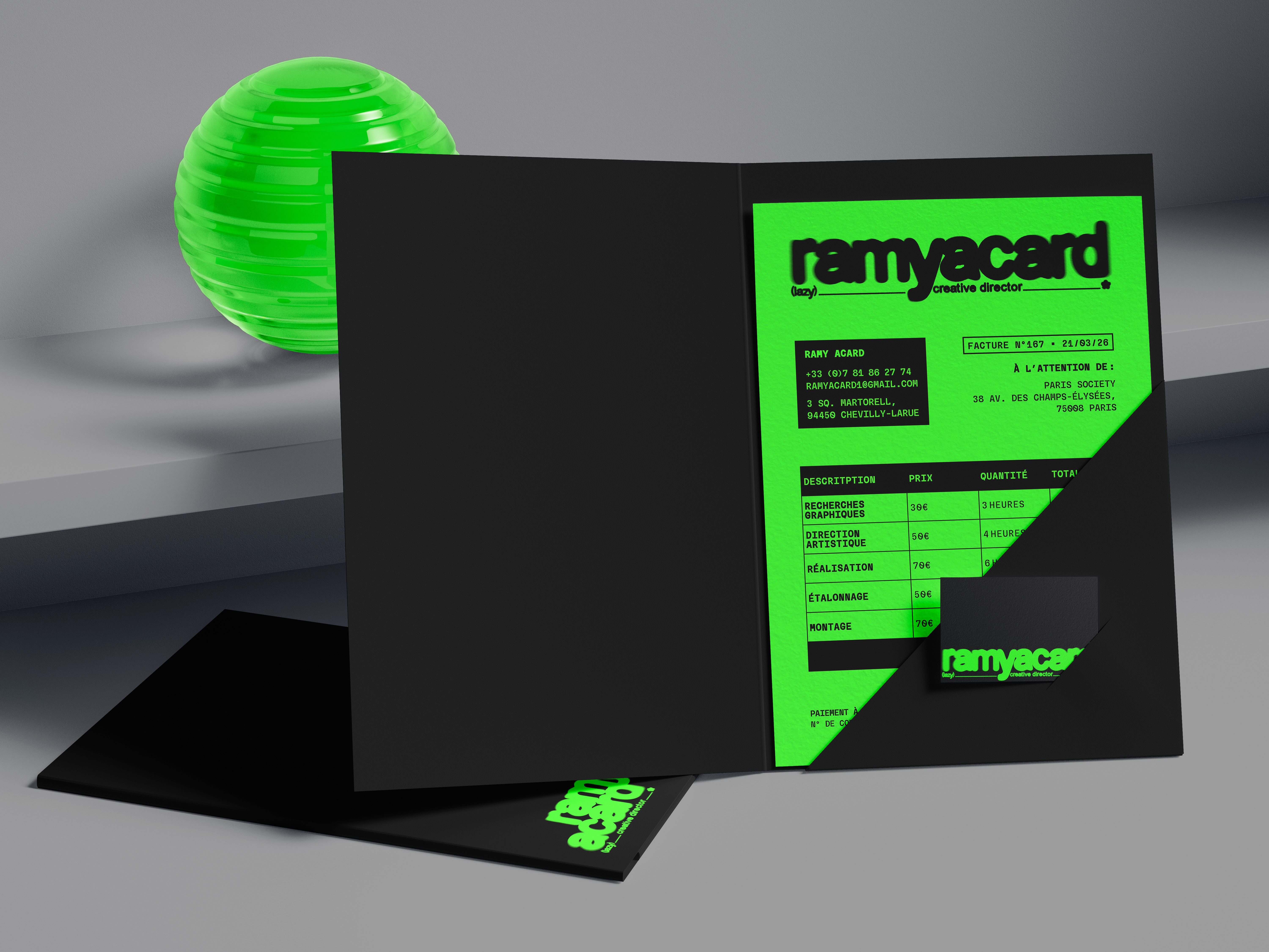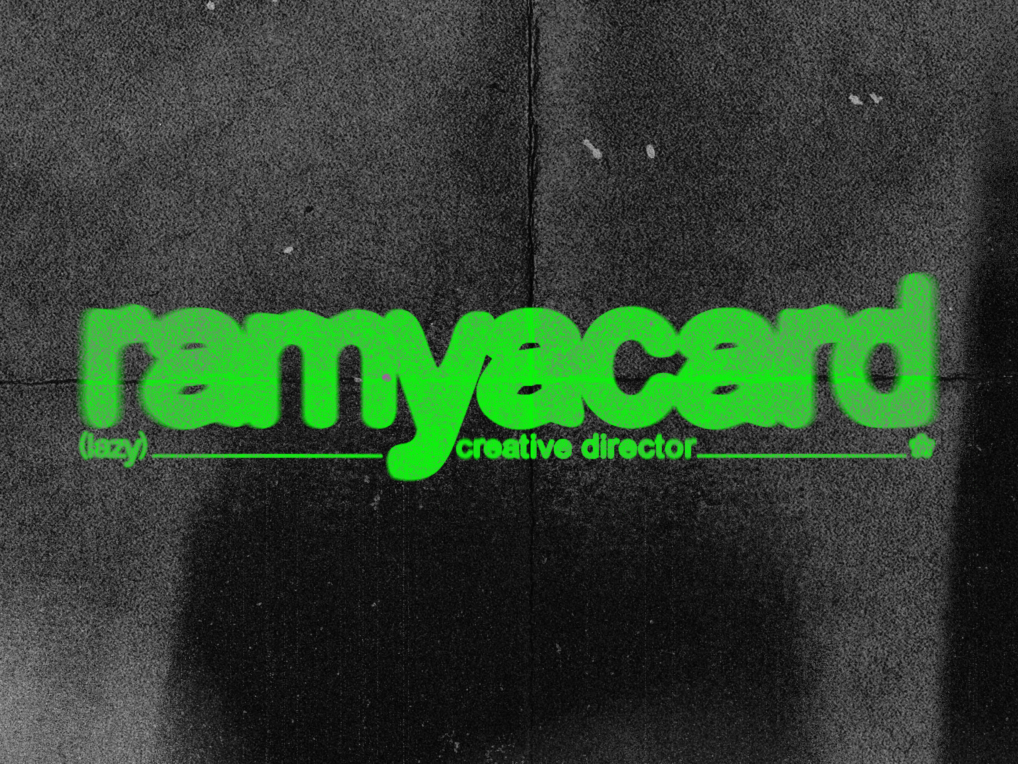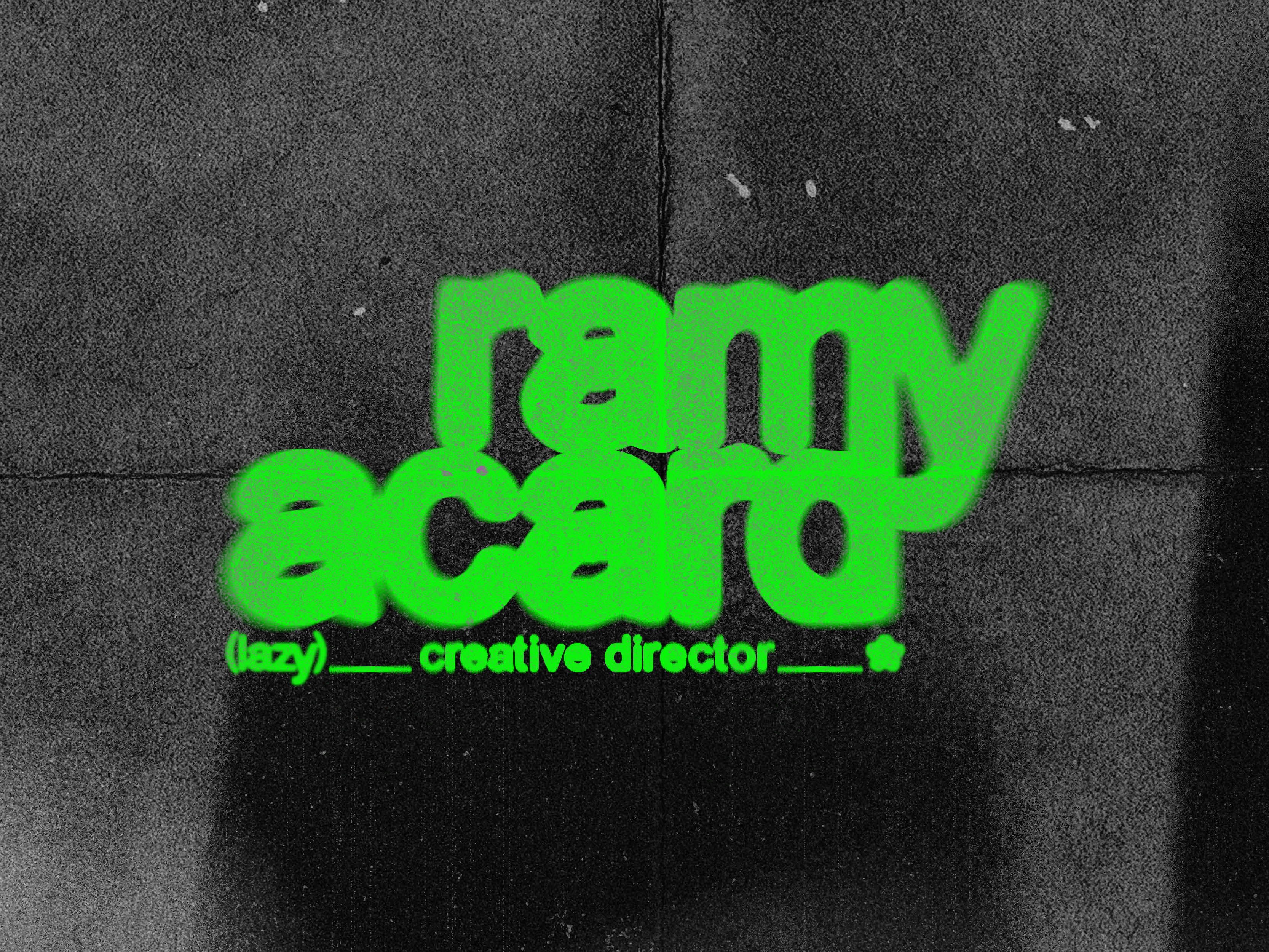 Pour l'identité de Ramy Acard, j'ai conçu un univers "grunge" et radical qui fusionne les codes techniques du montage vidéo avec une approche brute et organique. J'ai articulé le projet autour d'un logotype modulaire décliné en versions large et courte. Pour refléter son travail de réalisateur, j'ai misé sur un contraste chromatique violent entre un noir profond et un vert néon électrique , directement inspiré des moniteurs de contrôle et des effets de post-production comme l'inversion de couches RVB. L'identité est imprégnée de grain et de textures bruitées , cohérente avec le style artistique de Ramy Acard.